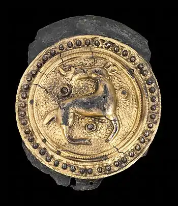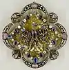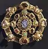 Дисковидные фибулы | Круглые фибулы известны с поздней Античности, но наиболее распространены были в период Раннего Средневековья. Дисковидные фибулы изготавливали франкские, англосаксонские, гуннские и прочие варварские мастера. Раннесредневековые варварские фибулы изготавливались, как правило, из золота и украшались эмалью, вставками цветного стекла, драгоценными камнями (гранаты, сапфиры, рубины) и пр. Особенно многочисленны франкские дисковидные фибулы VI—IX веков[2]. |