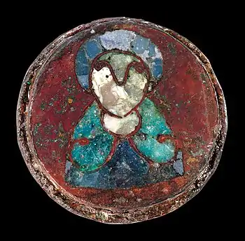 На лицевой стороне броши изображен погрудный портрет человека с нимбом над головой, что позволяет сделать вывод, что это святой или, возможно, Христос, однако установить это достоверно не представляется возможным ввиду схематичности изображения. Черты лица фигуры обозначены с помощью изогнутого медного стержня с петлями на концах, петли изображают глаза, а изгиб между ними — нос. Рот и другие детали не обозначены вовсе. Лицо и шея сделаны из бело-зеленоватой эмали, нимб — синей. Одежда фигуры состоит из двух частей — верхняя, напоминающая плащ или мантию священника, выполнена из зелёной эмали и украшена двумя выпуклыми медными петлями, нижняя — темно-синего цвета.