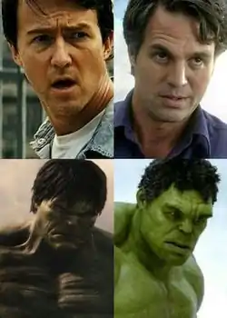 ![]() Брюс Бэннер / Халк в исполнении Эдварда Нортона (слева) в «Невероятном Халке» (2008) и Марка Руффало (справа) в «Мстителях» (2012) | |
