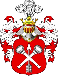В красном поле две серебряные булавы и между ними стрела в звезду. Нашлемник: три страусовых пера.