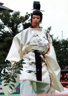 - ветка деревца сакаки (непременный аксессуар танцев кагура, входящих в репертуар бугаку);