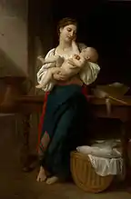 В 1860-е годы Бугро обратился к теме материнства, что, по-видимому, произошло под влиянием Милле. Однако образы Бугро принципиально отличались по трактовке темы и художественному её решению. Во-первых, обобщённости образов Милле Бугро противопоставил максимально подробное изображение лиц, показывая достоинство и индивидуальные черты персонажей. В картинах Бугро не встречаются атрибуты тяжёлого труда, и как обычно для академического искусства, форма превалировала над содержанием[32]. Метод работы сложился не сразу, художник изначально использовал для идиллий классические формы и не сразу осознал возможности изображения непринуждённой обстановки. Если Милле ставил своих моделей в нужную ему позу, то Бугро, работая с женщинами и маленькими детьми, позволял им играть, ссориться, кувыркаться и т. д. В удачные, по его мнению, моменты он зарисовывал движения, каждый раз пытаясь запечатлеть мимолётное: откровенность взгляда и жеста, подсознательные порывы. Естественность сюжета обеспечивала его занимательность и ценилась покупателями[33].