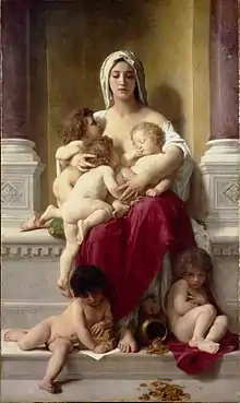 Середина и вторая половина 1870-х годов оказались для Бугро тяжелейшими в эмоциональном плане — произошла череда утрат в его семье. В 1875 году в возрасте 16 лет заболел и умер старший сын Бугро — Жорж. В октябре 1876 года родился третий сын — Морис; однако 40-летняя жена художника скончалась в начале апреля 1877 года от осложнений после родов. Младенец-сын умер в июне того же года[44]. Состояние, в котором пребывал художник, подтолкнуло его к религиозной живописи. Одной из самых проникновенных религиозных картин в его творчестве стала «Пьета», основанная на скульптурной группе Микеланджело из Собора св. Петра в Риме. Он не стал развивать ренессансную традицию изображать Богоматерь на фоне града Иерусалима; окружив Деву Марию ангелами, художник подчёркивал, что смерть Христа была глубочайшей личной катастрофой. После смерти жены Бугро написал «Богоматерь Утешение», в которой показал Марию посредником между горем матери, переживавшей смерть младенца, и Небесами[45]. Тему этой картины художник впоследствии использовал во многих своих произведениях, вводя элементы, почерпнутые из живописи Возрождения. Так, в «Милосердии» 1878 года он изобразил опрокинутый кувшин, полный золотых и серебряных монет, попираемый левой ногой матери, подчёркивая, что дети дороже денег. Книги, на которые опирается мальчик, выражают желание матери дать детям образование. Несложные аллегории впоследствии привели к серьёзным творческим исканиям Бугро[46]. Известный американский искусствовед того времени — Эрл Шинн (1838—1886), — писал о «Милосердии»: