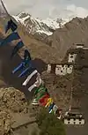 Слева: Дханкар-гомпа - монастырь крепость на высоте 3894 м. Справа: Молитвенные флажки (лунгта) в Дханкар-гомпа | ||