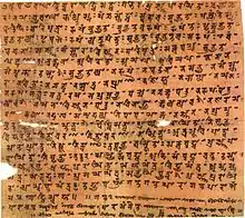Примерно в начале нашей эры началось создание нового литературного жанра сутр с акцентом на идеале бодхисаттвы, широко известного как Махаяна («Великая колесница») или Бодхисаттваяна («Колесница бодхисаттвы»)[54]. Самые ранние из этих сутр назывались не «Махаяна», а вайпулья (обширные, обширные) сутры или гамбхира (глубокие, глубокие) сутры[55]. Существуют различные теории возникновения Махаяны. По одной версии «это было в первую очередь текстовое движение, сосредоточенное на обнаружении, проповедовании и распространении махаянских сутр , которое развивалось в рамках традиционных буддийских социальных и институциональных структур и никогда от них не отходило[56]. Ранние дхармабханаки (проповедники, читавшие сутры) были влиятельными фигурами и распространяли эти новые тексты в буддийских общинах[55]. Многие из махаянских сутр были написаны на санскрите (гибридных формах и на классическом санскрите), а затем переведены на тибетский и китайский, сформировав соответствующие каноны ( Кангьюр и Тайсё Трипитака), которые затем разработали свои собственные текстовые истории. Санскрит был принят буддистами на севере Индии в кушанскую эпоху, а санскритская буддийская литература стала доминирующей текстовой традицией в Индии вплоть до упадка буддизма[54].