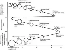 Закон географической зональности: IR – радиационный индекс сухости; диаметры кружков пропорциональны биологической продуктивности ландшафтов