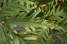 Почки крупные, яйцевидные. Листья супротивные, непарноперистые, обычно состоят из пяти или семи листочков; иногда листочков три — так нередко бывает на цветущих побегах[17]. Края листочков — пильчато-зубчатые, форма — яйцевидная или удлинённо-ланцетная, длина — от 5 до 10 см[6]. Молодые листья нередко имеют тёмно-красный или фиолетовый цвет, что обусловлено повышенным содержанием антоциана; пигмент обладает свойством преобразовывать световую энергию в тепловую — это важно для развития растения ранней весной. Листья имеют сильный характерный неприятный запах[8].