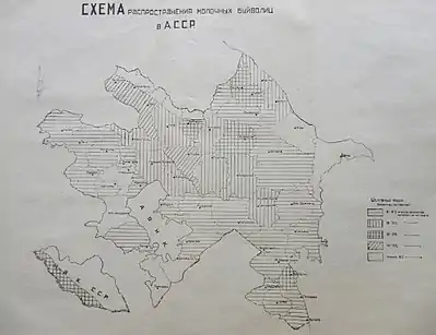 Буйволы распространены по территории Азербайджана неравномерно (см. схематическую карту). Разведению буйволов благоприятствует жаркий климат и обилие воды, в горах выше 1800—2000 м буйволов не разводят. По данным 1930-х годов, наибольший процент буйволов в общем стаде крупного рогатого скота достигался в трёх регионах. Первый — это районы вдоль течения Куры от Кюрдамирского до Самухского района, а также районы вдоль течения рек Алазани и Иори — там процент буйволов в общем стаде крупного рогатого скота составлял 30—50 %. Второй массив — это Хачмазский и Дивичинский (Шабранский) районы на берегу Каспийского моря, где процентное соотношение примерно такое же. Третий массив — это Астрахан-Базарский (Джалильабадский) и Масаллинский районы, где процент буйволов в общем стаде крупного рогатого скота составлял 30—40 %[9]
