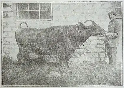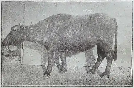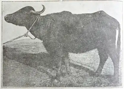 Буйволица № 15 Азербайджанской зоотехнической станции, возраст 7 лет, рост 132 см, живой вес 462 кг, годовой удой 1270 л.
