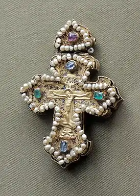 ![]() Крест наперсный. Вклад царицы Марии Петровны, жены Василия Шуйского. Начало 17 века. ГТГ | |