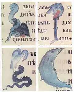 Буквицы в форме животных из Евангелия Хитрово, 1390-е годы