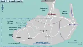 Территория полуострова до середины перешейка выделена в состав района Южный Кута, который, в свою очередь, относится к округу Бадунг провинции Бали. В составе района имеется шесть административно-территориальных единиц низшего уровня — поселений (индон. kelurahan): Бено́а, Джимбаран, Куту́х, Печату́, Танджу́нг-Бено́а и Унга́сан[3]. Руководителем района (чама́том) по состоянию на май 2015 года является Вая́н Ви́рья (индон. Wayan Wirya), занявший эту должность в январе 2014 года[4].