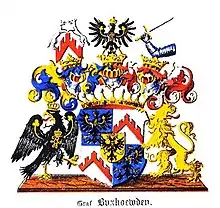 Щит покрыт графской короной, на которой имеются три серебряных открытых, с красной подкладкой, украшенных клейнодами рыцарских шлема с дворянскими на них коронами; из которых на среднем виден в первой и четвёртой частях изображённый орёл. На правом шлеме красное стропило, у него на зубцах видны две серебряные лисицы, бегущие одна к другой навстречу. Из левого шлема выходит рука в латах, вооружённая мечом. Щит держат чёрный прусский орёл и золотой лев с красным высунутым языком и с поднятым хвостом. Намёт на щите с правой стороны золотой с голубым, а с левой серебряный с красным цветом.