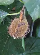 Пестичные цветки в двухцветковом (в результате редукции среднего цветка) дихазиальном соцветии, с 3—5-лопастным (6-лопастным[10]) околоцветником, сросшимся с нижней трёхгнёздной завязью, имеющей по две семяпочки в каждом гнезде, с тремя удлинёнными волосистыми столбиками и трёхлопастными рыльцами, собраны по 2—3 (4) и окружены четырёхлопастной обёрткой (плюской), сидящей на ножке. Плюска имеет форму урны[23]:405, с четырьмя или тремя (в случае редукции двух цветков) створками, усажена снаружи мягкими шипами[23]:405 и покрыта шиловидными листочками 3—10 мм длиной, к моменту созревания плодов разрастается и древеснеет. Ножка плюски прижато-опушённая, 0,8—1,8 см длиной. Цветёт в апреле — мае, одновременно с распусканием листьев.