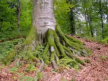 Корневая система мощная, но неглубокая, без ясно выраженного стержневого корня[10] (утрата стержневого корня происходит в двадцатилетнем возрасте[17]), с боковыми корнями, уходящими косо вглубь почвы, и большим количеством поверхностных корней, нередко огибающих встречающиеся камни и срастающихся между собой. Корни соседних деревьев в лесу также иногда срастаются между собой. Мелкие окончания корней нередко направлены вверх и щёткообразно ветвятся в слое мёртвой подстилки, образуя микоризу. У старых деревьев часто сильно разрастаются корневые лапы, вследствие чего в комлевой части ствола появляется желобчатость[10]. Порослевое возобновление от пня происходит до возраста 30 (60) (20—50[17]) лет. По другим данным, бук хорошо возобновляется пнёвой порослью при диаметре пня 10 см, но уже при диаметре 20 см пнёвое возобновление резко снижается[10]. Корневых отпрысков не даёт. Извилистая форма бука европейского (Fagus sylvatica f. tortuosa) может размножаться за счёт корневых отпрысков[18].
