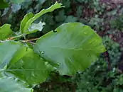 Листорасположение очерёдное, двурядное, угол между ортостихами составляет 180° или 120°[14]:406. Черешки опушённые, (0,5) 0,8[22]—1,0 (1,8) см длиной. Листья эллиптические, широкозаострённые к основанию и к вершине, 4—10[20] (15[22]) см длиной, 2,5—7[20] (10[22]) см шириной, с перистым жилкованием, с пятью — восемью[10] парами боковых жилок, по краю слабоволнистые и иногда с редкими небольшими зубцами, сверху тёмно-зелёные и блестящие, снизу светлее и со слегка приподнятыми жилками, в молодости шелковисто-опушённые, позже голые и лишь по краю и жилкам снизу прижато-опушённые.