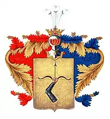 Щит увенчан дворянскими шлемом и короной со страусовыми перьями. Намёт на щите золотой, подложенный красным и голубым.