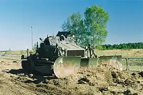 Бульдо́зер — самоходная землеройная машина, представляющая собой гусеничный или колёсный трактор, тягач и тому подобное с навесным рабочим органом — криволинейным в сечении отвалом (щитом), расположенным вне базы ходовой части машины.