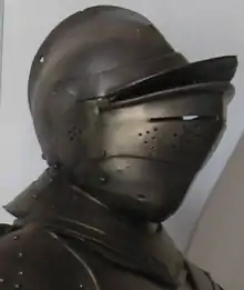 Закрытый бургиньот XVI века. Обратите внимание на складывающийся наподбородник образующий подобие забрала (были также и менее удобные варианты, где наподбородник не складывался, а просто откидывался вниз)