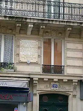![]() Мемориальная доска на стене дома 29 по улице Этьенна Марселя в Париже | |