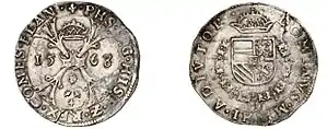 При Филиппе II (1566—1598) для испанских Нидерландов чеканили крупные серебряные монеты весом 34,46 г при содержании 28,21 г чистого серебра[1]. Они являлись аналогом серебряного каролюса[6], серебряного аналога золотого каролюсдора, имевшего хождение в государстве с 1543 года[7]. На аверсе помещено изображение короля, на реверсе гербовый щит с короной на фоне бургундского креста[8]. Крест являлся одним из символов бургундского округа, в который входили 17 нидерландских провинций[9]. Также выпускали кратные номиналы в ½, 1⁄5, 1⁄10 и 1⁄20 бургундского талера[6].