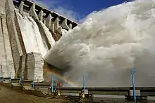 Поверхностный водосброс предназначен для сброса избыточного притока воды в половодье и паводки, когда приток не может быть пропущен через гидроагрегаты ГЭС либо аккумулирован в водохранилище. Максимальный расход воды, который может быть пропущен через водосброс, составляет 10 400 м³/с[4].