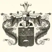 Описание герба: Выдержка из Общего гербовника Щит разделен горизонтально на две части, из коих в верхней в голубом поле изображены крестообразно два золотые Ключа; а в нижней части в красном поле серебреный Полумесяц рогами в низ обращенный. Щит увенчан обыкновенным дворянским Шлемом с дворянскою на нем Короною и тремя Страусовыми перьями. Намет на щите голубой и красный, подложенный золотом. |