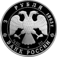 В центре — эмблема Банка России (двуглавый орёл художника И. Билибина), под ним: слева — обозначение металла, проба сплава, в центре — товарный знак монетного двора, справа — содержание драгоценного металла в чистоте. По окружности надписи, обрамлённые кругом из точек: вверху — «3 РУБЛЯ 1993 г.», внизу — «БАНК РОССИИ». | Аверс |