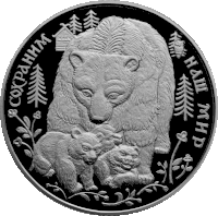 Изображение бурой медведицы с тремя медвежатами на фоне елей и травянистой растительности, вверху слева — деревянная изба, справа — сидящая на ветке сова, по окружности — надпись: «СОХРАНИМ НАШ МИР» |