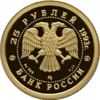 В центре диска — эмблема Банка России (двуглавый орёл художника И. Билибина), под ним: слева — обозначение металла, проба сплава, в центре — товарный знак монетного двора, справа — содержание драгоценного металла в чистоте. По окружности надписи, обрамлённые кругом из точек: вверху — «25 РУБЛЕЙ 1993 г.», внизу — «БАНК РОССИИ». | Аверс |