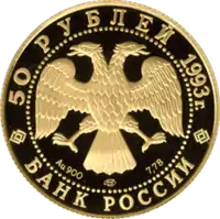 В центре диска — эмблема Банка России (двуглавый орёл художника И. Билибина), под ним: слева — обозначение металла, проба сплава, в центре — товарный знак монетного двора, справа — содержание драгоценного металла в чистоте. По окружности надписи, обрамлённые кругом из точек: вверху — «50 РУБЛЕЙ 1993 г.», внизу — «БАНК РОССИИ». | Аверс |