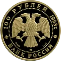 В центре диска — эмблема Банка России (двуглавый орёл художника И. Билибина), под ним: слева — обозначение металла, проба сплава, в центре — товарный знак монетного двора, справа — содержание драгоценного металла в чистоте. По окружности надписи, обрамлённые кругом из точек: вверху — «100 РУБЛЕЙ 1993 г.», внизу — «БАНК РОССИИ». | Аверс |