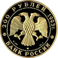 В центре диска — эмблема Банка России (двуглавый орёл художника И. Билибина), под ним: слева — обозначение металла, проба сплава, в центре — товарный знак монетного двора, справа — содержание драгоценного металла в чистоте. По окружности надписи, обрамлённые кругом из точек: вверху — «200 РУБЛЕЙ 1993 г.», внизу — «БАНК РОССИИ». | Аверс |