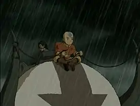 ![]() Аанг и Катара летят на Аппе через бурю в поисках Сокки и рыбака | |||||