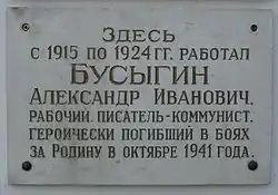 - У входа на Ростовский паровозоремонтный завод была установлена мемориальная доска: «Здесь с 1915 по 1924 г. работал Бусыгин Александр Иванович, рабочий, писатель-коммунист, героически погибший в боях за Родину в октябре 1941 г.»