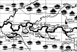 До села Будакова 30 вер. Дорога идет по возвышенному древнему берегу Иртыша, правый оного берег ведет за собою сосновый лес, левый — низкий березник и вдаль болота. Таковая же дорога продолжается до Знаменского погоста или Чередова 20 вер., лежащего на озере Изюке, которое ни что есть, как залив из Иртыша. В сем озере, а паче в другом, в десять верст от Тары, ловят много рыбы даже и зимою, весьма вкусной. Едучи от Чередова, дорога почтовая идет влево на Аев реку, а другая ближайшая, по которой бывает проезд обозам, идет вдоль Иртыша большею частию чрез татарские селения. Сделаны для летней дороги просеки, но зарастают, и мосты сносит водою. Для того по ней не ездят летом[16].