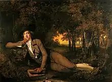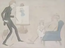 - Художник изображает, как молодой Милле предпринимает попытку совместить фантазию и натурализм в своей картине «Фердинанд, соблазняемый Ариэлем», произведении, иллюстрирующем пьесу Уильяма Шекспира «Буря». Художник находится возле мольберта, на котором стоит эскиз к картине.