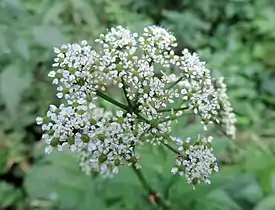 Соцветие — зонтик с 12—20 гладкими лучами. Лепестки белые, голые, обратнояйцевидные. Цветёт в июле.