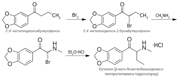 Бутилон может быть синтезирован в лаборатории по следующей схеме: