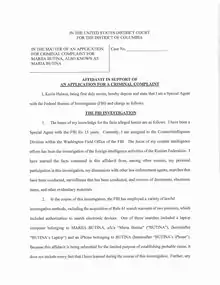 Согласно материалам американского Минюста, когда в августе 2016 года Бутина прибыла на территорию США по студенческой визе, то она заявила о планах учиться в округе Колумбия, но фактически занималась лоббизмом и являлась «агентом влияния России». В сентябре 2016 года, указано в обвинении, Бутина написала электронное письмо гражданину США в целях организации публичного мероприятия, на котором она могла бы оказать влияние на взгляды американских официальных лиц. Упоминалось также о множестве других её попыток установить контакты с представителями американского истэблишмента. В частности, The Washington Post сообщала, что Бутина общалась с Джеффри Гордоном, членом предвыборной команды президента Трампа, куратором вопросов национальной безопасности[31].