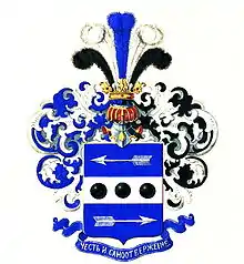 На щите дворянский коронованный шлем. Нашлемник: пять страусовых перьев: среднее — лазуревое, второе и четвёртое — серебряные, крайние — чёрные. Намёт на щите справа лазуревый, слева чёрный, подложенный серебром. Девиз: «ЧЕСТЬ И САМООТВЕРЖЕНИЕ» серебряными буквами на лазуревой ленте.