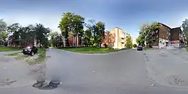 В состав посёлка входят семь четырёхэтажных П-образных домов (улица Свердлова, дд. 21, 21а, 23, 23а, 25/28, ул. Пушкина, д. 20, ул. Чайковского, д. 56)[4]. Зеркально отражённые дома образуют систему «дворсадов», которые по задумке архитектора должны стать центром общественной жизни. Кроме жилых помещений, в домах предусмотрены объекты торговли и социально-бытовых услуг (прачечная, магазин потребительских товаров и др.). Для жителей посёлка был организован клуб в бывшей синагоге, располагающейся по соседству.