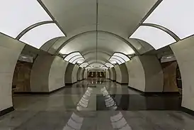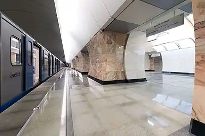 - Платформенную часть длиной 162,5 м (боковые залы) и 94,68 м (центральный зал). Радиус центрального зала — 4,4 м, высота центрального зала — 6,1 м, ширина платформы — 19,1 м, ширина пилонов — 3 м, ширина проёмов — 3 м. В каждом втором проёме, со стороны вестибюлей, размещаются установки дымоудаления. Путевая стена облицована алюминиевыми панелями, пилоны со стороны боковых залов облицованы мрамором Саянского месторождения оттенков красного цвета с тёмными прожилками и пятнами, а со стороны центрального зала — белым.