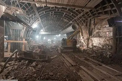 С середины декабря 2013 года начались работы по строительству наклонного хода станции, ведущего в её южный торец. В проходке наклона также использовалась заморозка грунтов. 30 апреля 2014 года мэр Москвы Сергей Собянин посетил объект, спустился на станцию, где ему доложили о завершении выемки грунтов в обоих станционных тоннелях к майским праздникам (полностью же основной объём проходческих работ по станции был завершён в апреле 2015 года[6]), а также о значительном прогрессе раскопки центрального зала, к этому моменту завершённой на две трети[7].