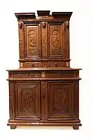 Типичный домашний буфет состоит из соединённых вместе или установленных друг на друга нижнего стола-шкафа и менее глубокого верхнего шкафа, с нишей между ними. Нижний шкаф состоит из большого отделения с полкой (закрываемого дверцами) и одного-двух выдвижных ящиков для столовой посуды. Верхний шкаф также с полками и дверцами (как правило застеклёнными)[1]. Такой вид буфета сформировался в XVII веке[2][3].