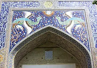 Симург на портале медресе Надир Диван-Беги (часть комплекса Лаби-Хауз)