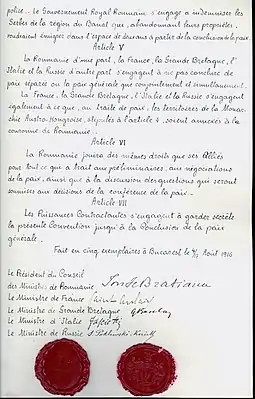 Договор состоял из двух частей: политического договора (семь статей) и военной конвенции (семнадцать статей). Румынское правительство должно было объявить войну Австро-Венгрии, в соответствии с положениями военной конвенции, не позднее 28 августа (новый стиль), согласно политическому договору. Взамен она должна была получить следующие территории: