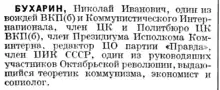 Никола́й Ива́нович Буха́рин (27 сентября [9 октября] 1888, Москва — 15 марта 1938, Коммунарка, Московская область) — русский революционер, советский политический, государственный и партийный деятель. Член ЦК партии (1917—1934), кандидат в члены ЦК ВКП(б) (1934—1937). Кандидат в члены Политбюро ЦК РКП(б) (1919—1924), член Политбюро ЦК ВКП(б) (1924—1929). Кандидат в члены Оргбюро ЦК РКП(б) (1923—1924). Лидер так называемой правой оппозиции в ВКП(б), последовательный противник политики коллективизации. Академик АН СССР (1929). Расстрелян в 1938 году.