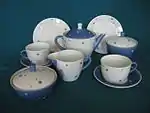 1964 г. — Чайный сервиз «Дачный (Утренний)». Фаянс. Весенняя выставка ленинградских художников 1965 год. Конаковский фаянсовый завод им. М. И. Калинина (г. Конаково, Тверская область).[9]