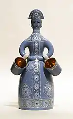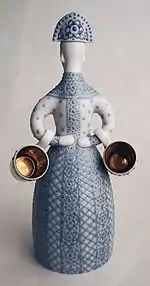 - Графин "Девица с вёдрами". Роспись глазурью и солями, позолота. Форма "Матрёшка". Фарфор. ЛФЗ.